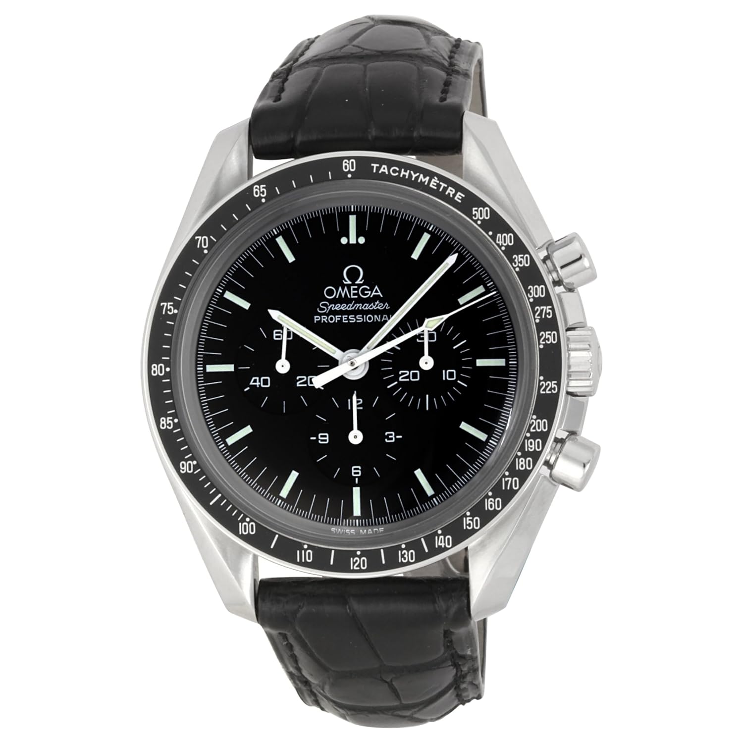 Black pvd-coated chromium steel case that has a black leather strap. Fixed black pvd bezel with tachymeter. Black dial with luminous silver-tone hands and stick hour markers. Minute markers round the outer rim. Chronograph - three sub-dials displaying: a minute, half an hour and 12 hours. Manual winding automatic movement. Scratch resistant hesalite crystal. Metal case back. Power reserve: 48 hours. Case diameter: 42 mm. Case thickness: 13.6 mm. Deployment clasp. Waterproof at 50 meters / 165 feet. Additionalinfo: 35705000, 357050, 3570-50. Omega speedmaster professional mens watch 3870.50.31.